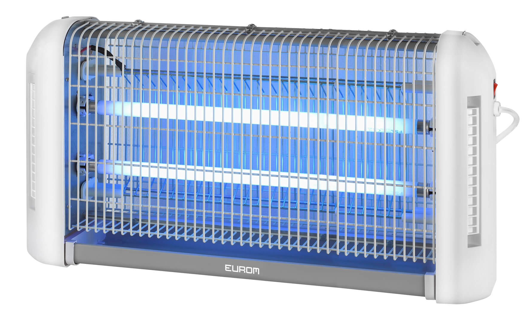De Eurom Fly Away All-round 40 is een elektrische insectendoder voor binnenshuis. Deze insectendoder heeft 2 UV lampen van 20 Watt, en kan daarmee tot 200 m2 insectenvrij maken. De lampen trekken de insecten aan, het hoogspanningsrooster elektrocuteert ze. Naast de UV lampen is er ook een speciaal lokstof reservoir. Het extra lokstof trekt de insecten nog meer aan, en jij bent zeker van een kamer zonder insecten.